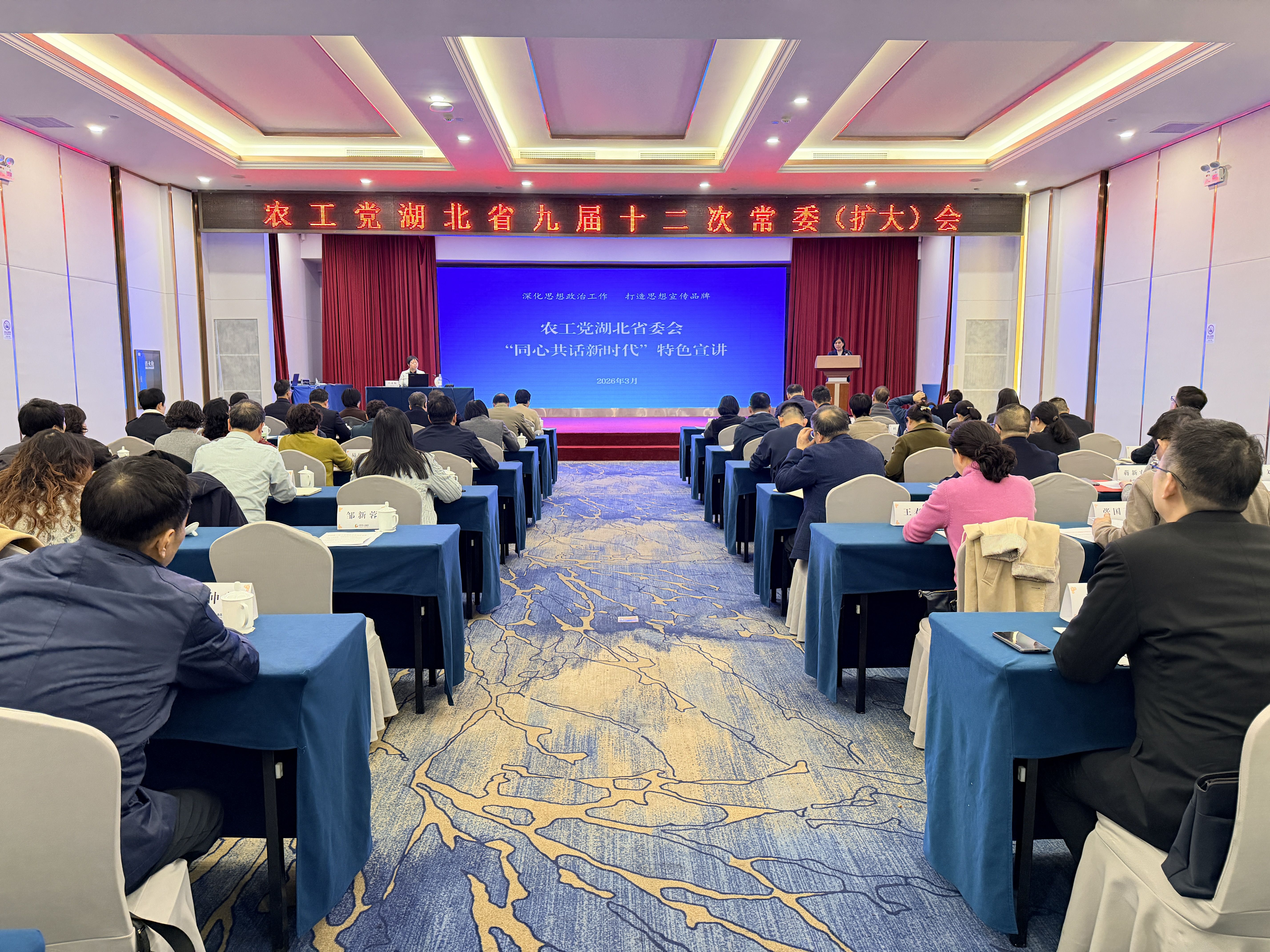 3月30日,为深入学习贯彻习近平生态文明思想和全国两会精神,提升党员参政履职能力,农工党湖北省委会在武汉举办“同心共话新时代”特色宣讲报告会,邀请全国人大常委会委员、环境与资源保护委员会副主任委员,农工党中央副主席吕忠梅作专题辅导报告。省政协副主席、农工党湖北省委会主委杨玉华主持报告会。省委会副主委黄惠宁、詹汉彬、缪小平、刘剑峰参加报告会。